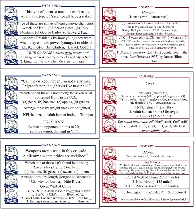 • [A Quick Note: Wit's End undergoes regular updates, incorporating a variety of new questions into the standard card set. This most recent print is copyright (c) 2023, as indicated on the lower left-hand corner of the back of the box.]