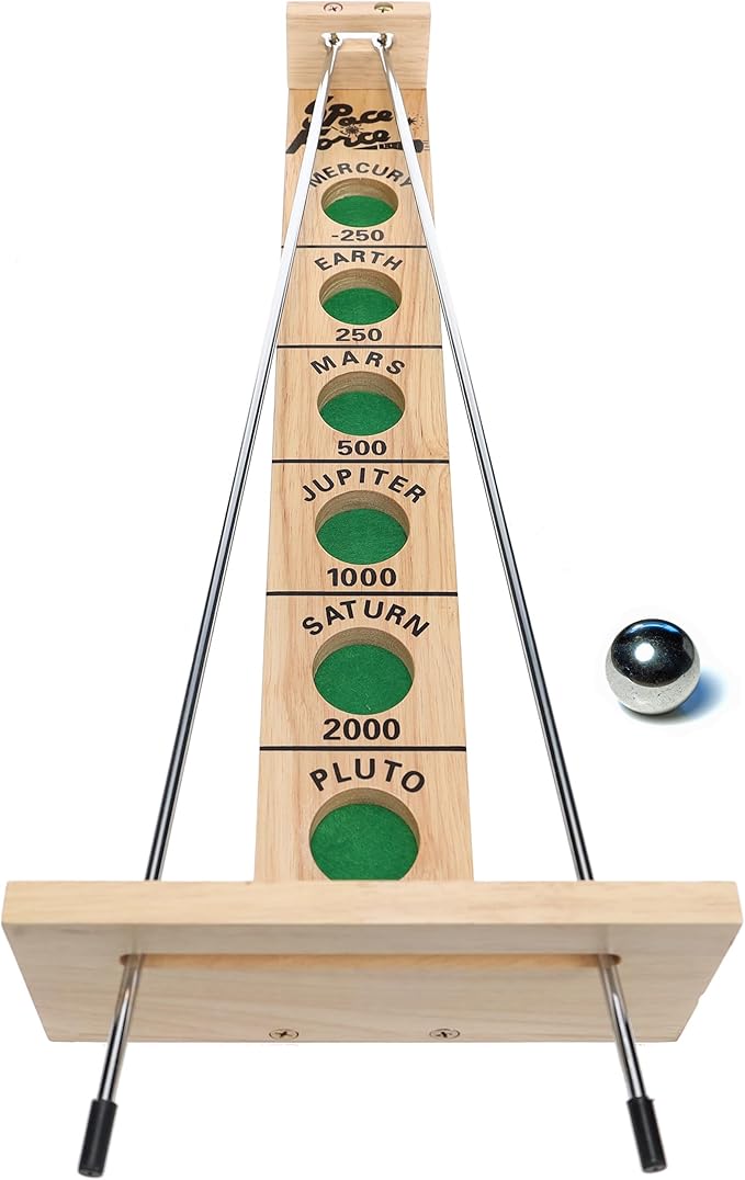 • OUT OF THIS WORLD: Shoot the Moon will be an instant hit in your house or office! This classic 1940’s nostalgia game is hilariously addictive, fun and challenging. The object of the game is to balance the ball on the metal track to score points in corresponding wells. Mercury, Earth, Mars, Jupiter, Saturn, and Pluto signify score zones. Seems simple enough right? See for yourself why people go crazy for this game.