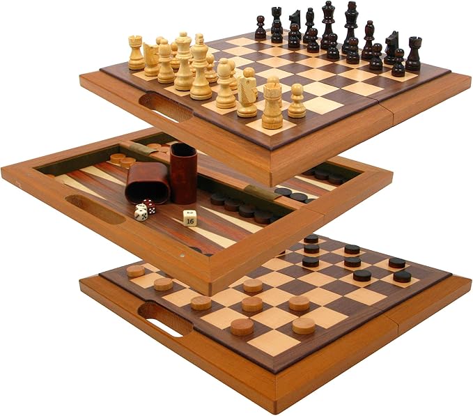 • 3-IN-1 CLASSIC BOARD GAMES – This high-quality wood constructed three in one car game contains game surfaces and pieces for chess, checkers, and backgammon. This chess set provides hours of fun for adults and kids alike.