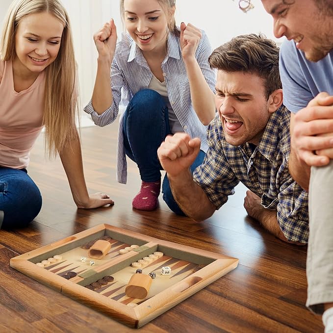 • COMES WITH ALL REQUIRED PIECES – The backgammon set comes with everything you need to play classic two player games. The checkers board game includes 2 dice cups, 4 playing dice, 1 scoring dice, 30 checkers/backgammon pieces, and 32 chess pieces.