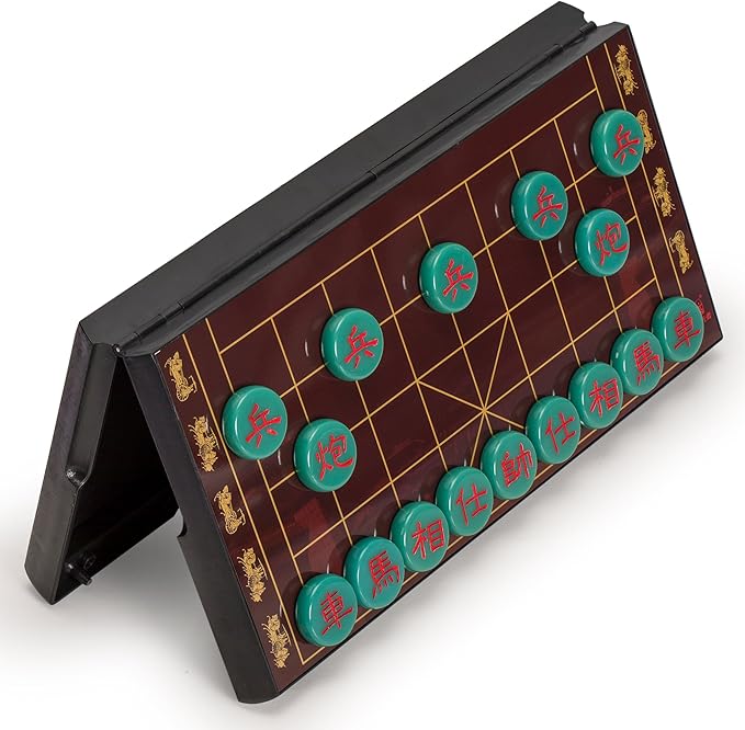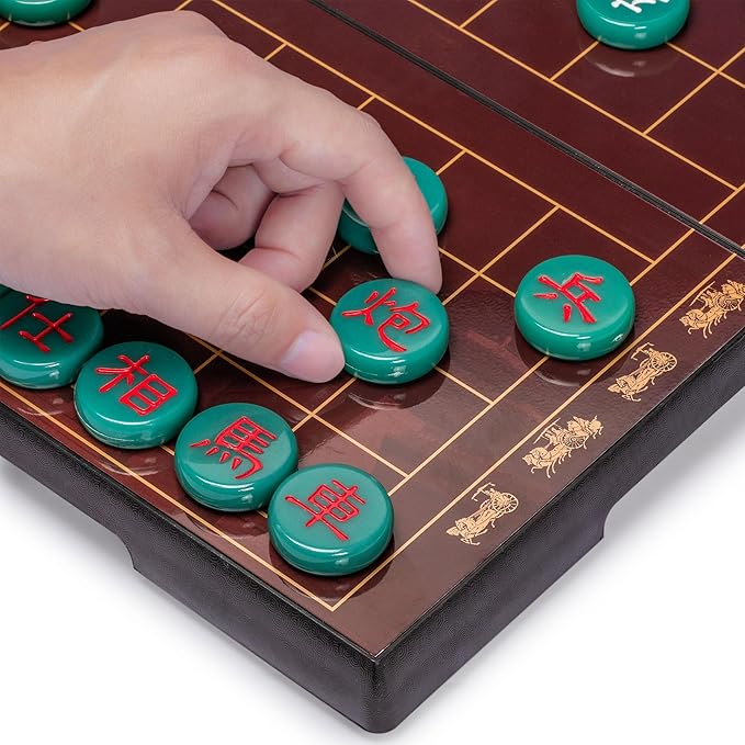 • Magnetic Chinese Chess Set: The board is outlined with golden grids and edges featuring decorative chariot designs; Strong built-in magnets on the board and playing pieces allow you to play virtually anywhere