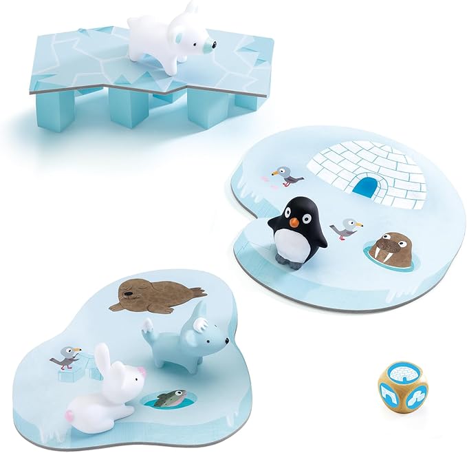• CONTENTS - 2 ice boards (start and finish), 1 cardboard bridge, 6 wooden supports, 4 soft-touch plastic figures (Arctic hare, polar bear, Arctic fox, penguin), and 1 wooden die.