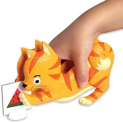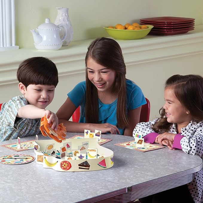 • INCLUDES: 1 Frankie Squeezer, 20 food game pieces, 4 placemat player boards, game spinner, game board (inside box lid), and guide
