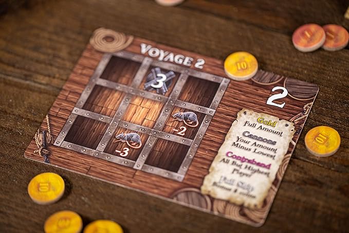 • BID AND WIN: Over three voyages, use numbered crew cards to bid for crates off the stack. Score coins by comparing your holds with everyone else, potentially scoring the visible cargo in your hold!