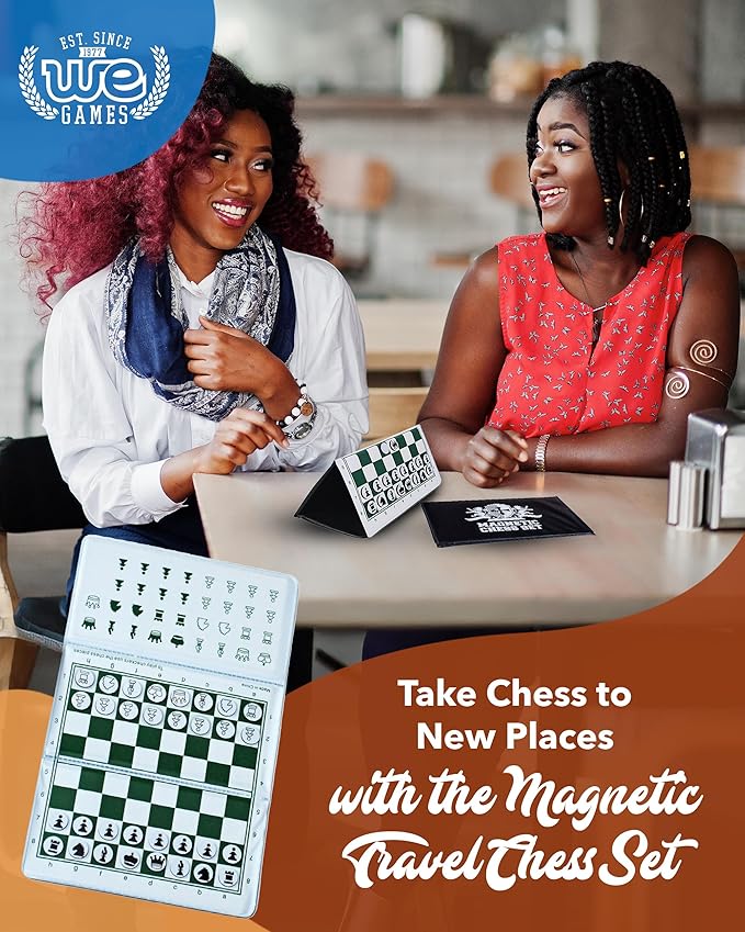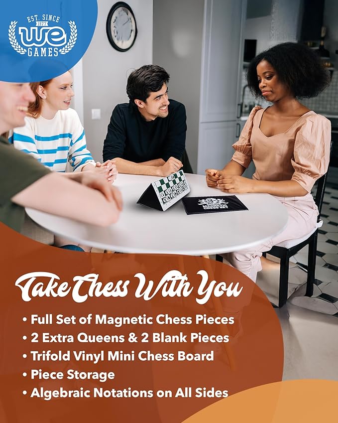 WE Games Mini Magnetic Travel Chess Set – 6-Inch Foldable Board with Durable Vinyl Pieces & Extra Queens– Indoor & Outdoor Magnetic Chess Game - White Logo
