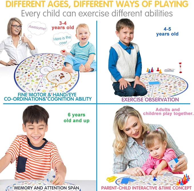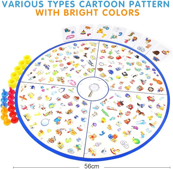 • BOARD GAME FOR FAMILIES-- Ditch the TV, cellphone, computer, both parents and kids, begin a detective board game together to increase the parent-child interactive, reignite family night. Now keep your eyes open and focus on the game board. Flip over clues cards and find the same patterns in the board, from figures and letters to animals and characters. Collect the most pairs to win and share the magic memories along the way.