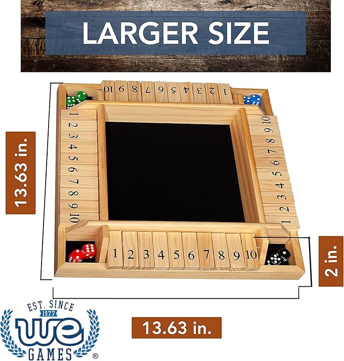 WE Games Shut The Box Board Game - Classic 4 Player Wooden Table Top Dice Game for Family Game Night, Natural Wood, 14 in., 10 Numbers, Classroom Play or Bar Fun for Adults