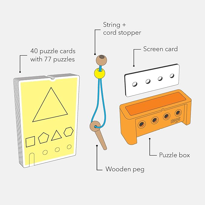 • COMPLETE STEM BRAIN GAMES FOR KIDS SET: Includes 40 cards, puzzle box, peg with string, and instructions. Puzzle games and brain teasers designed for tactile learners and fans of logic games.