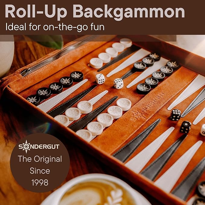 • Deluxe Travel Backgammon: Our Sondergut Deluxe Backgammon features pop-up playing field side walls to keep dice on the board during play. Our games have been the go-to for gamers and travelers alike since '98! Unrolled the board measures 15.75 x 12" and weighs just over 1 pound. Rolled up it is as compact as a mini umbrella. Making it the ideal companion for all your adventures.