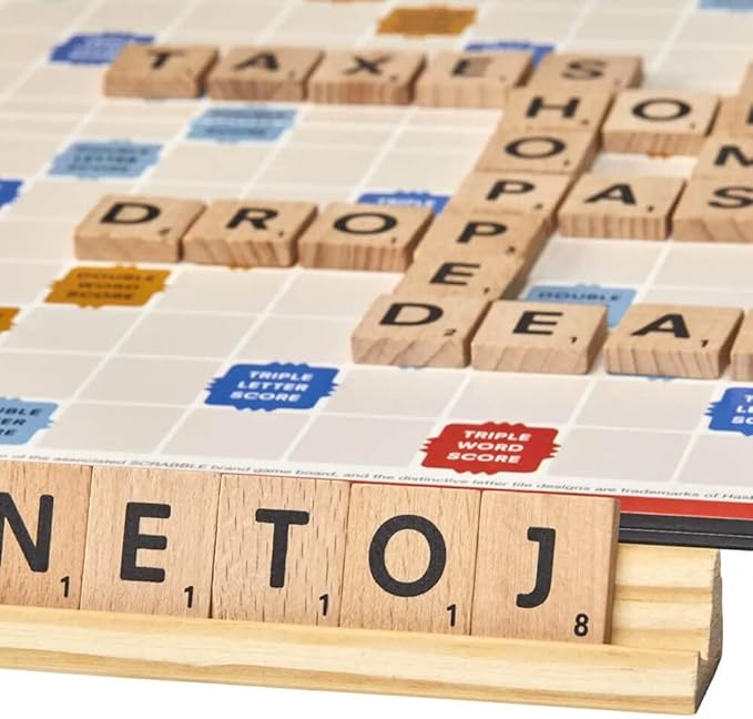• WOODEN TILES AND RACKS: This edition of the Scrabble game features 100 wooden letter tiles and wooden tile racks. The textured gameboard helps tiles stay on the board
