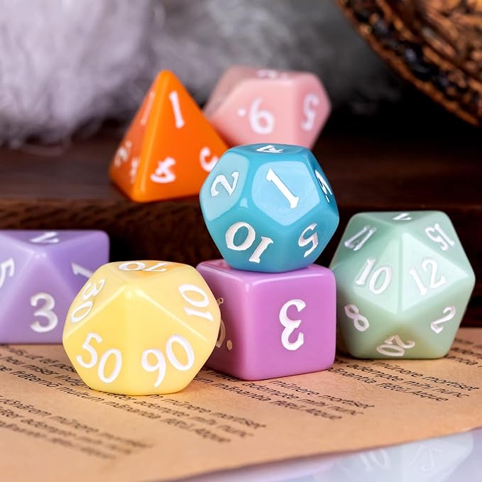 • Colorful Macaron Dice Set: Consists of 7 different dice - one 1* D20, 1*D12, 2*D10 (0-9 and 00-90),1*D8, 1*D6 and 1*D4 with a fairy-tale atmosphere. Each polyhedral dice has a different warm&soft color: from sakura pink, mint green, to butter yellow, powder blue, taro purple, purple and orange. The whole set look particularly sweet, clean, dreamy and healing, which is a great way to ignite the players' passion for creating stories and participating in them.