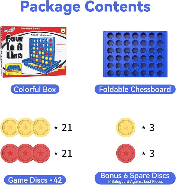 • [42 discs + 6 spare discs] Missing one disc affects the board game, The board requires 42 discs, if miss one, will lost the fun of playing. So Pup Go has 6 spare discs. Includes 21 red discs, 21 yellow discs, 3 spare red discs and 3 spare yellow discs