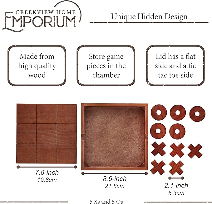• [Unique Hidden Design]: 1.5-inch (3.8cm) tall tic tac toe wooden game has an internal chamber that holds the 5 circles and 5 crosses; Flip the 7.8 by 7.8-inch (19.8 x 19.8cm) lid to store your game pieces