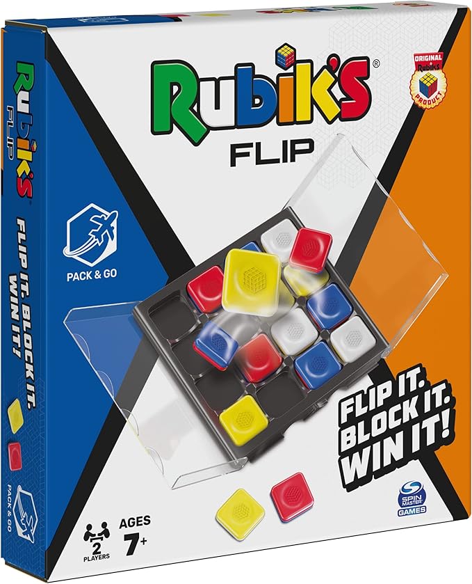 • RUBIK’S FLIP: In this fast-moving two-player game, you’ve got 8 moves each to place your tiles, flip your opponent’s tiles and lock in a 3-in-a-row line. You read that right… win or lose in only 8 moves