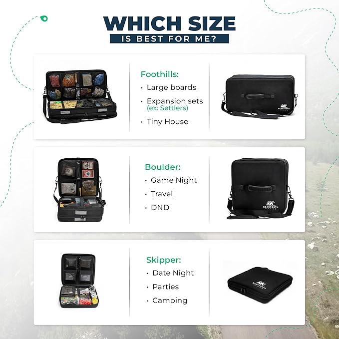 • The Skipper is the smallest size, designed for portability. Slide it under the seat in your car, put it inside your carry-on, or toss it in the stroller. Holds approx. 1-4 games.* The Boulder itself is the ideal carry on bag. Great for game night or travel! Holds approx 5-10 games.* The Foothills is great for storing entire game collections or traveling with a lot of games. Holds 10-15 games.* *Varies depending on size of the board game.