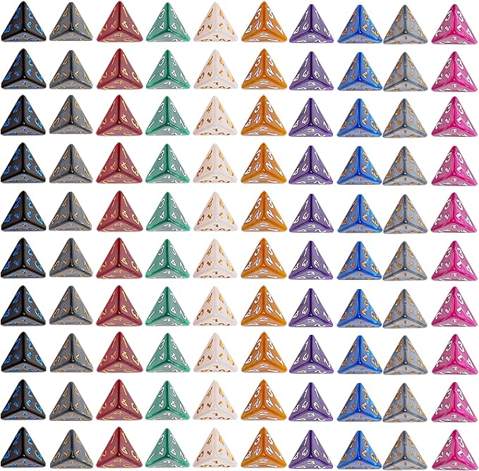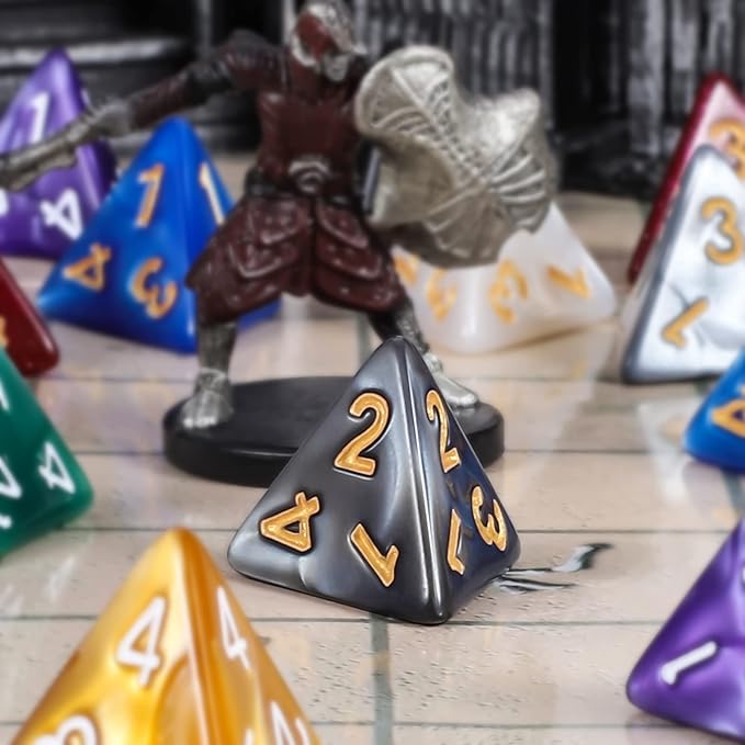 • 🎲 Easy to Read: These D4 Polyhedron dices have gold, black and white painted lettering which are as large as possible on each surface for easy reading.
