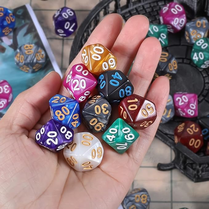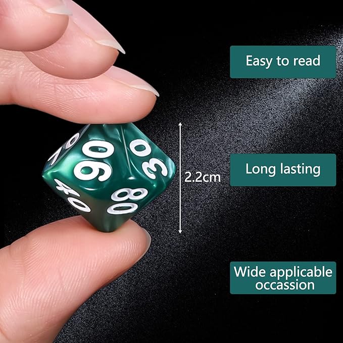 • 🎲 Easy to Read: These D% Polyhedron dices have gold, black and white painted lettering which are as large as possible on each surface for easy reading.