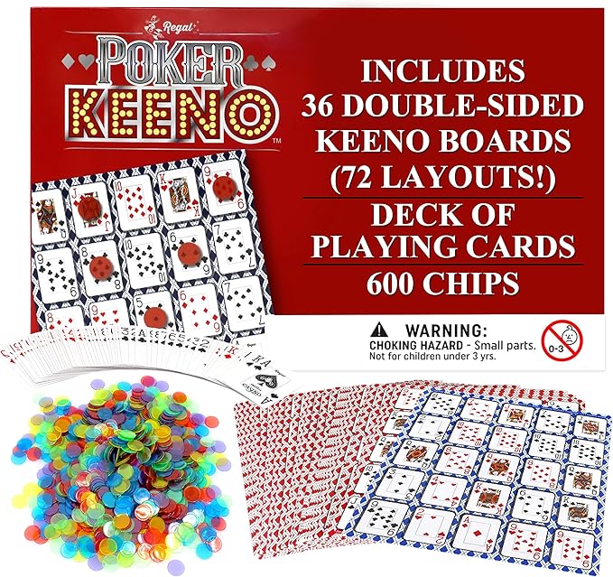 Regal Games - Poker Keeno Bulk Game Set - Includes 36 Two-Sided Boards, 600 Scoring Chips, 1 Deck of Standard Poker Cards - 72 Unique Board Layouts- Casino Night Card Game- Compatible w Poker Keno