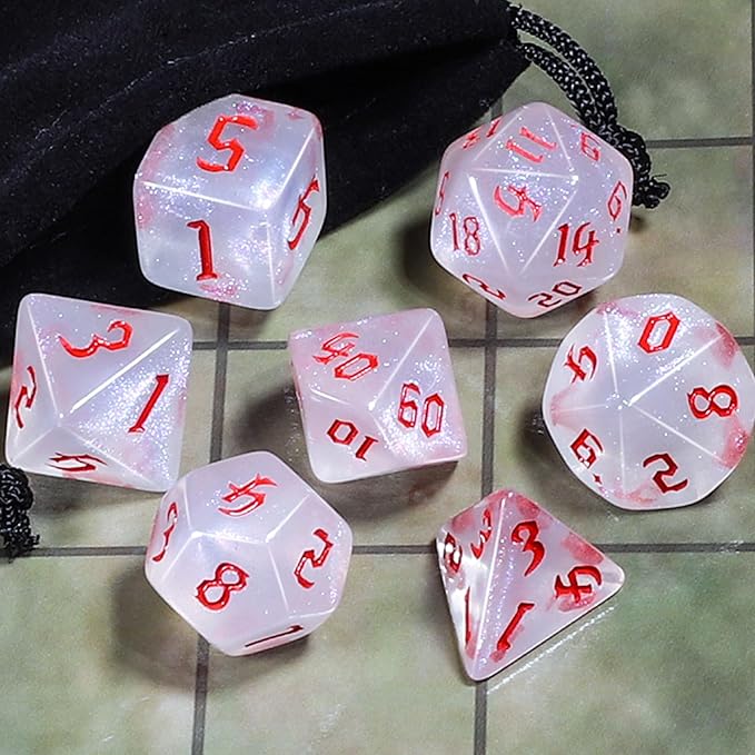 • 🎲 7pcs Polyhedral dice set: Contains one d20, one d12, two d10 (00-90 and 0-9), one d8, one d6 and one d4 and a velvet dice bag.