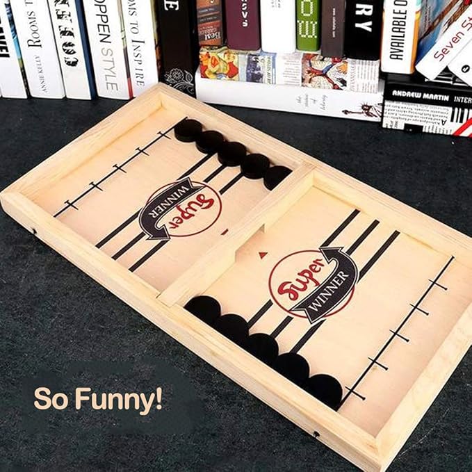 • Large Size Funny & Exciting Game:Start the game and place five pucks on each side of the board. Slide both ends of the elastic band into the side grooves so that they snap into place. Whoever clears the board first wins.