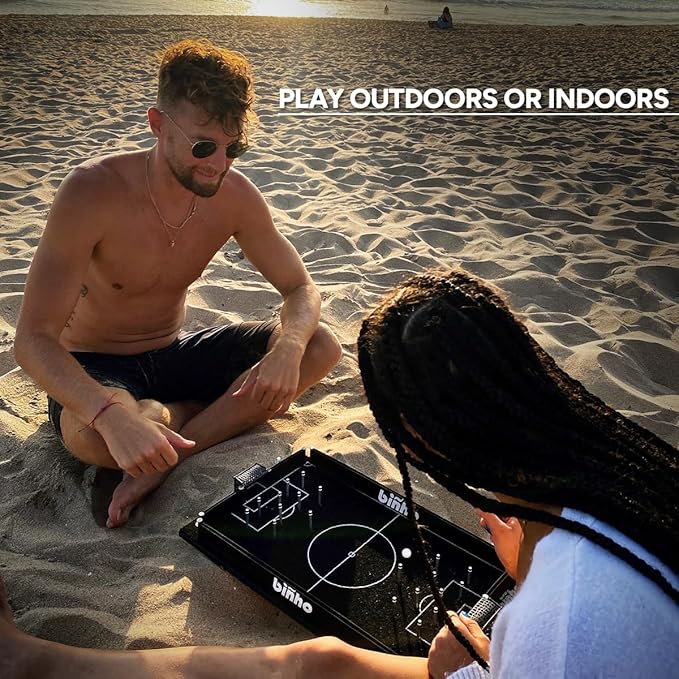 • Complete Set - Create memorable moments with our Binho Board. Each set comes with everything you need: 22” x 13” x 3” Binho board, 2 balls, 2 score pins, 2 red/yellow cards, 2 white goals, 20 aluminum metal removable player pieces, 12 barrier pieces, 6 black exterior elastic bands (2 long, 4 short), 1 rules pamphlet, Binho drawstring bag, and 1 Binho penalty coin.