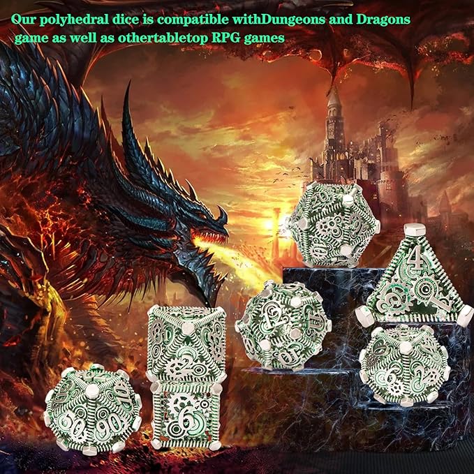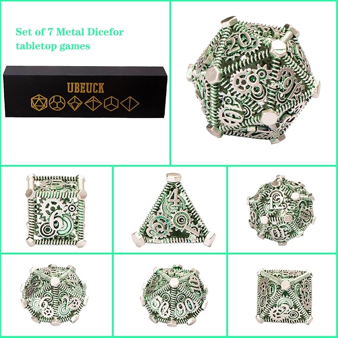 DND Metal Dice Set, UBEUCK 7PCS Gear Metal DND Dice Set for Dungeons & Dragons Board Games Boxes(Gear Green)