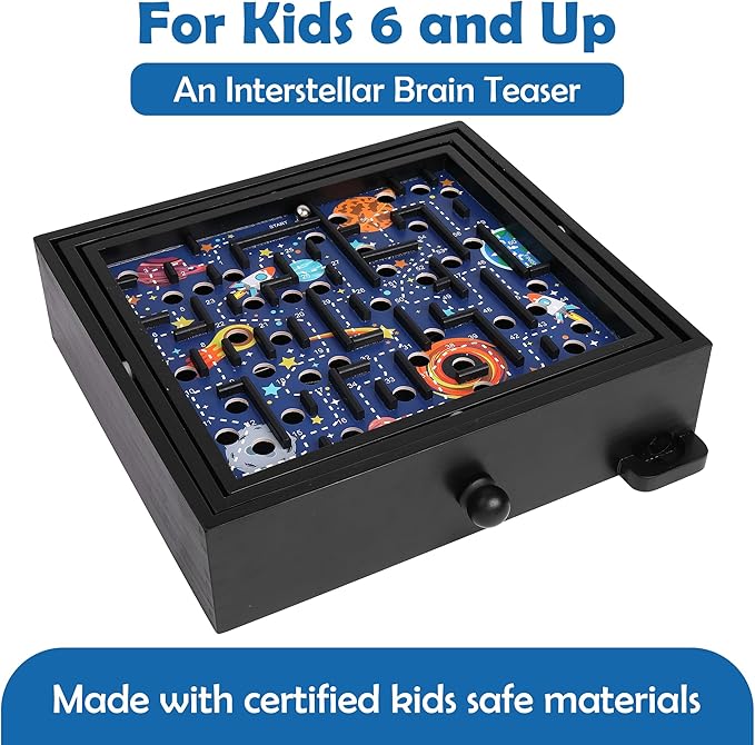 • INTERGALACTIC LABYRINTH : Embark on an out-of-this-world journey with our Space-themed Wooden Labyrinth Maze! Designed in the USA and crafted with precision using high-quality wood, this maze offers a smooth surface for an exhilarating and fluid gameplay experience. The set includes two steel balls for added cosmic fun.