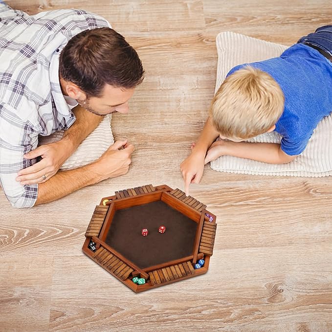 • Funny Board Game: This family-friendly shut the box board game can provide hours of entertainment for up to six players at once due to its shape. each side of the six-sided hexagon box contains a row of wooden tiles numbered from 1-10, and each with two dice included. Attention- Not suitable for children under the age of 3 years. Small parts! Choking hazard