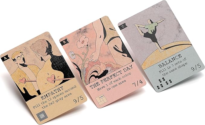 • Five pursuit (polyomino) cards are available each round. You roll five dice to assign colors to those shapes. Then you have to decide which shape to draw on your brain board.