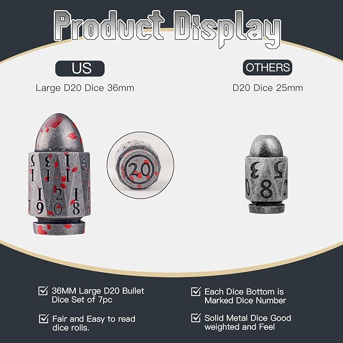 • 【DND Dice】PCCECQEE's Bullet Dice consists of a dice set with a large D20 dice 36MM and 26MM D4、D6、D8、D10、D%、D12 .The round bullet head design makes the dice stand out on the gaming table and leads players into the world of DND dice games.7 dice are labeled with a number on the bottom to make quick and easy distinctions. To protect the table, it is recommended to use with a tray and mat.