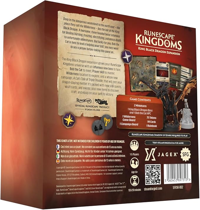 • The King Black Dragon expansion grows your RuneScape Kingdoms universe with an infamous new boss to face, Bob the Cat to meet, Prayer skill to master, Wilderness location to explore, and a whole new campaign, A Cat’s Tale of Triple Trouble, that will test your dragon-slaying mettle!
