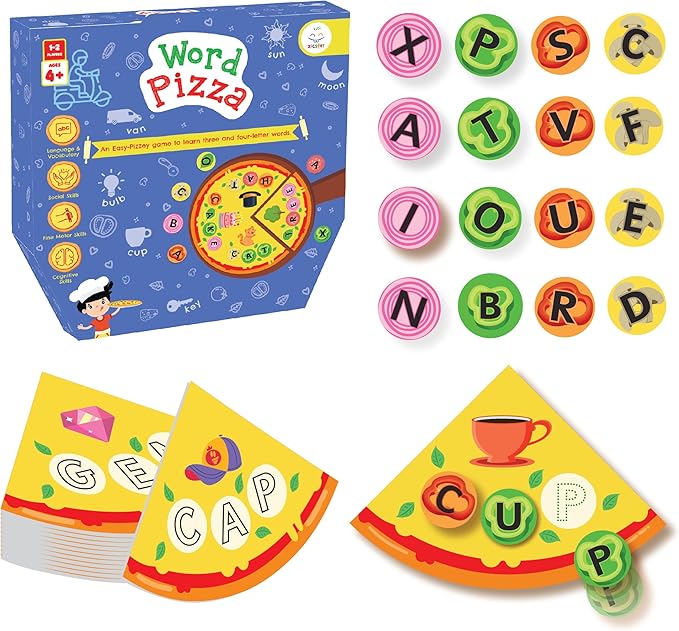 • [ EASY TO PLAY ] Choose between the 3 letter side or the 4 letter side on the Pizza Slice Cards; Each player starts with 1 Slice. Place the matching alphabet tokens on the slice and say it aloud to complete 1 slice. Complete 4 slices to complete the pizza and get 1 ‘Pizza Badge’. First player to collect 2 badges wins!