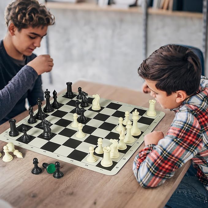 • Upgraded Chess Set: This Travel Chess Set includes 34 weighted Staunton-style pieces (with 2 extra queens). The 4" king weighs 3.46 oz (98g), larger and heavier than standard pieces. Includes a 20" x 20" silicone roll up chess board with 2.25" squares. Total set weight: 5.6 lbs. Perfect for casual games, serious matches, or travel