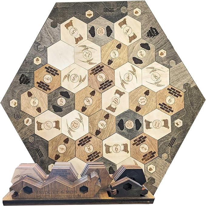 • This best selling, personalized settler's board is the perfect board game gift for settler game fans! The artistic, personalized game board is laser cut and engraved wood with genre-matching stains. The expanded game board set can accommodate 2-6 players while the expansion set accommodates 2-6 players. Compatible with Catan rules and player pieces.