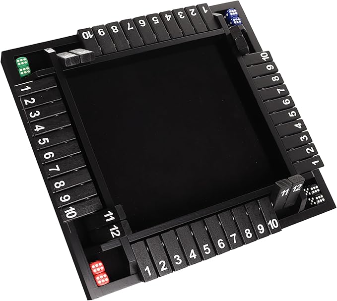 • Material & Size: The shut the box game board is made of pine wood and has a quality noise dampening felt mat inside the game board; the game board dimensions are 13" x 13" and has 12 flip number blocks per side