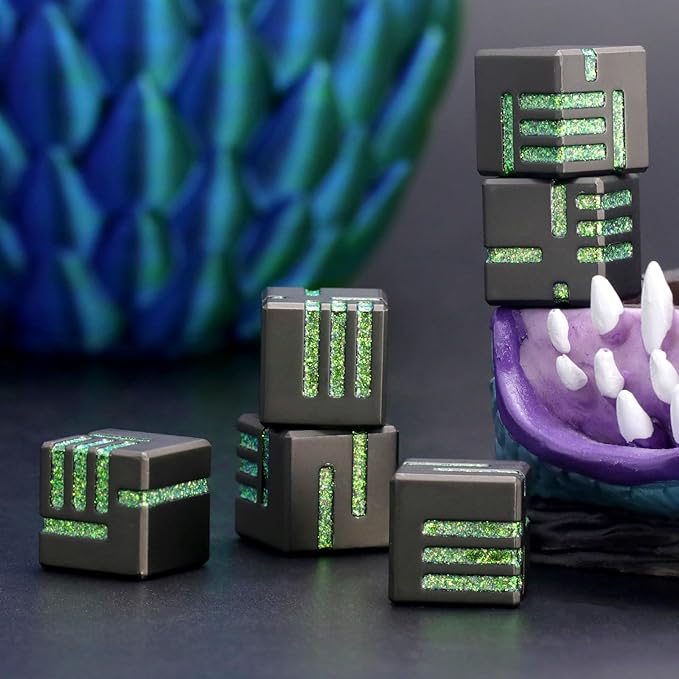 D6 Dice Set of 6 Pcs 16mm, Cool Fancy 6 Sided Dice Great Metal D6 for DND RPG Dungeons and Dragons (D6 Matte Black & Glitter Green)