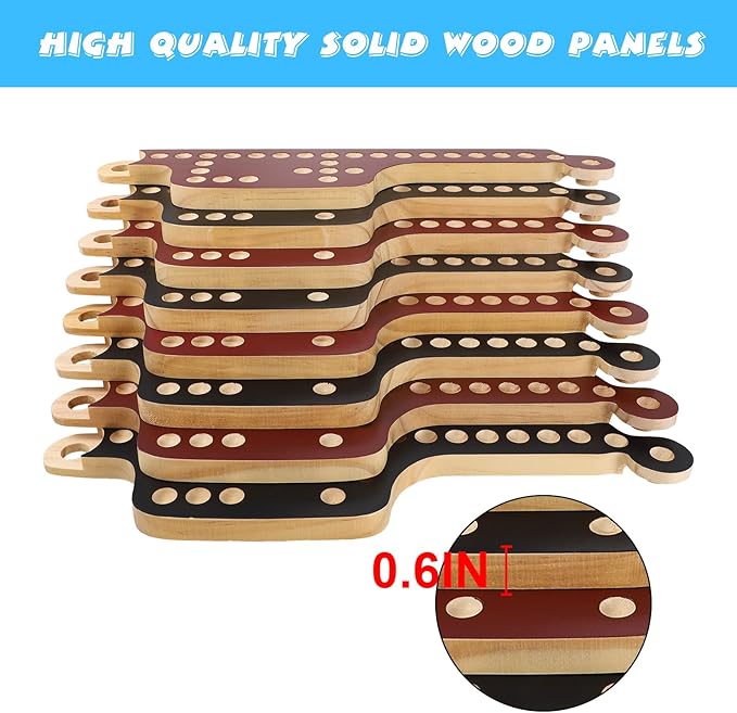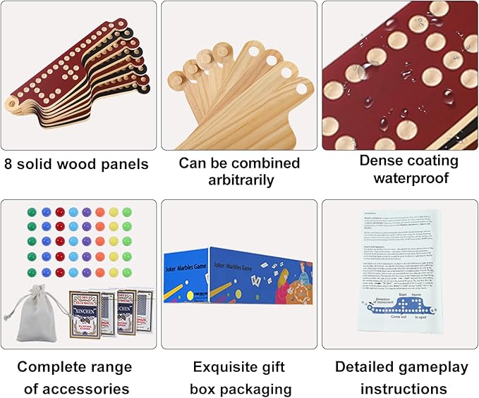 • 【High Quality】: Pegs and jokers board game is crafted with sturdy solid wood boards, and we strictly avoid using cheap plastic boards. The wooden boards are coated with a special paint that is waterproof and moisture-resistant. The chessboard has 8 wooden boards, each with a different color and support gameplay for 2-8 players! There are 40 marbles in total, with each color having 5 marbles, making it easy to track each player's position. Includes 4 sets of beautifully designed playing cards and two cloth bags.