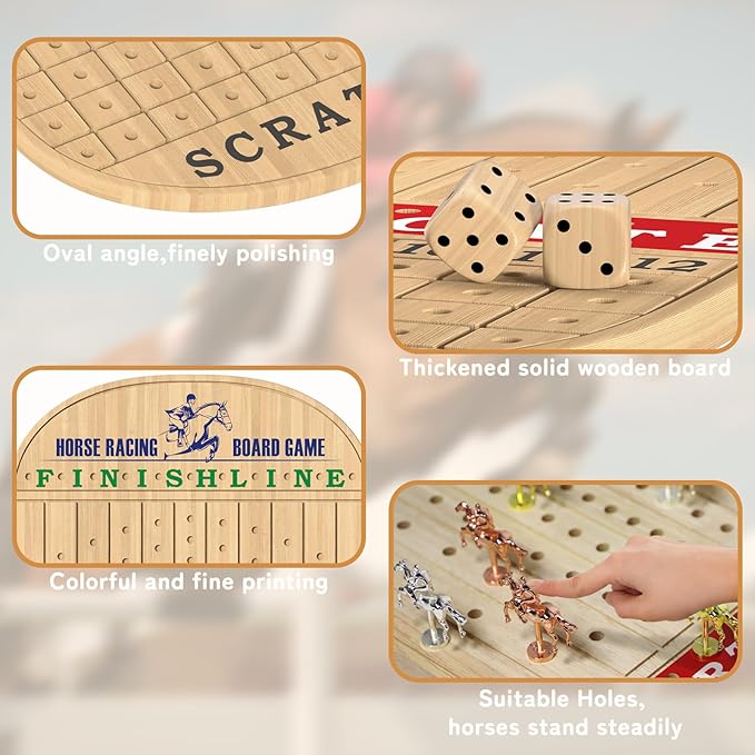 • 【Easy to Play For All】The horse racing game is easy to learn and great for players of all ages with different skill levels. Each player chooses self favorite horse, then rolls the wooden dice to determine which horse can move forward ( for example, sum of dice is number 6, the horse marked "number 6“ can move forward along its track) and each competitor has an equal chance at victory. The horse that reaches the finish line is a win! It's that simple! PS: The horse racing board game can accommodate up to 11 players.