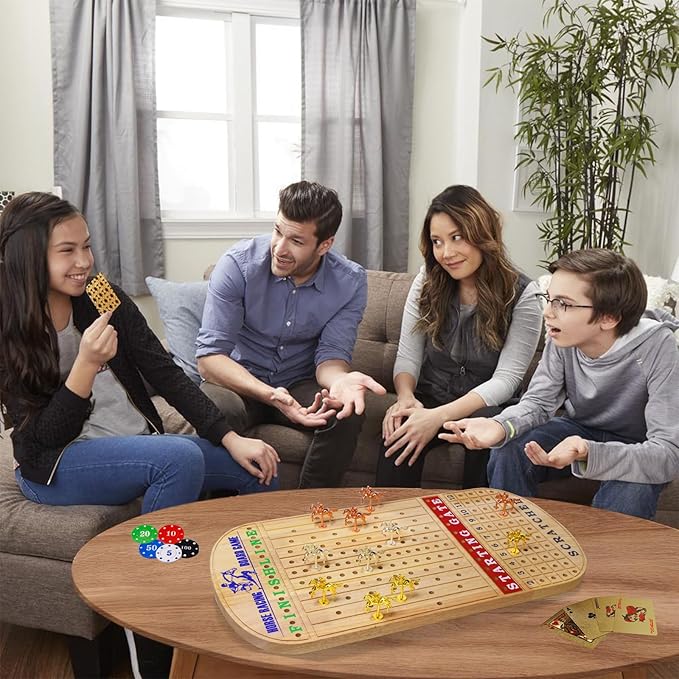 • 【Solid Wood Game Board & Metal Horses】The 23IN horse race game board is made of premium solid wood and printed in color to ensure its durability and artistic. Also, the game board is coated with a waterproof layer to prevent deformation or corrosion and smooth corners are for more safety. The 11pcs lifelike metal horses are made of pure quality metal, which are exquisitely crafted and look like small handicrafts. The exciting horse race game is not just a horse racing game but a collectible handicraft.