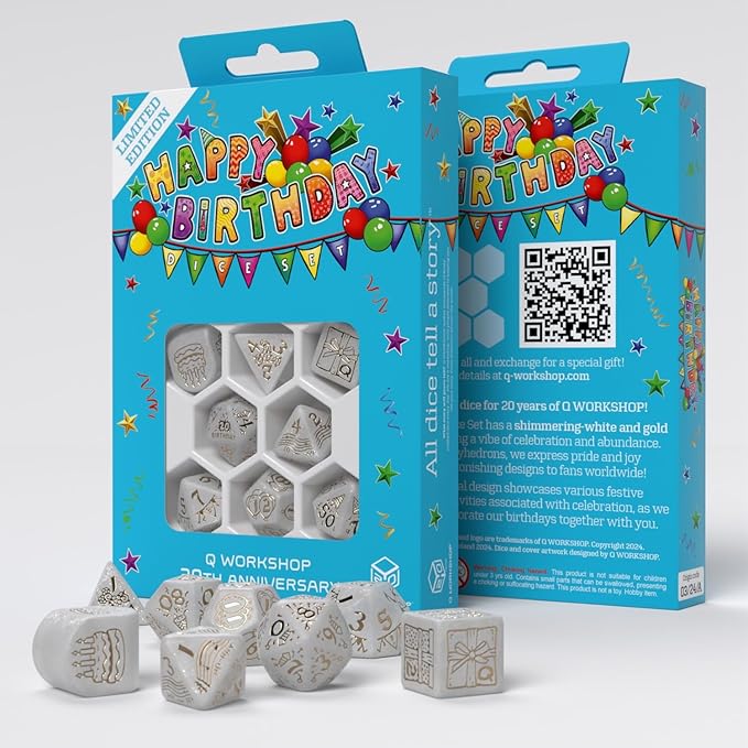 • Limited Edition: Q WORKSHOP celebrates 20 years with Happy Birthday Dice, limited to 1000 sets.
