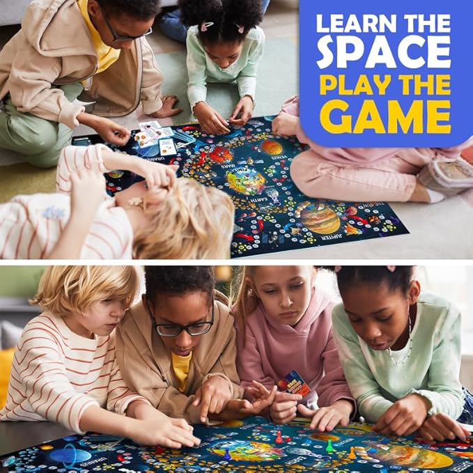 • HUGE SPACE MAP GAME: In this race you have a chance to check your luck & basic knowledge of the world; Board game size 47"x 28" with 100 educational question cards; Move your pawn through the space map while overcoming obstacles with correct answers