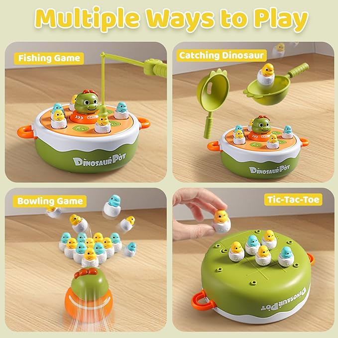 • 【4 IN 1 Dinosaur Games】 This toddler board game includes 2 magnetic fishing rods, 2 nets, 1 rotating board, 1 dinosaur rolling car and 10 egg tumblers. It offers 4 ways to play: pop up game, magnetic fishing game, tic-tac-toe and bowling mode. Great family games for kids age 3-5 4-8, interactive game for 2 players