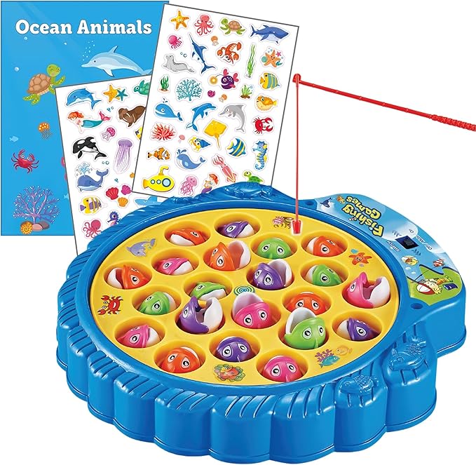 Haktoys Fishing Game Play Set Includes 21 Fish and 4 Fishing Poles on Rotating Board with Music On/Off Switch, Ocean Animal Sticker Book with Reusable Stickers | Board Game for 1-4 Players