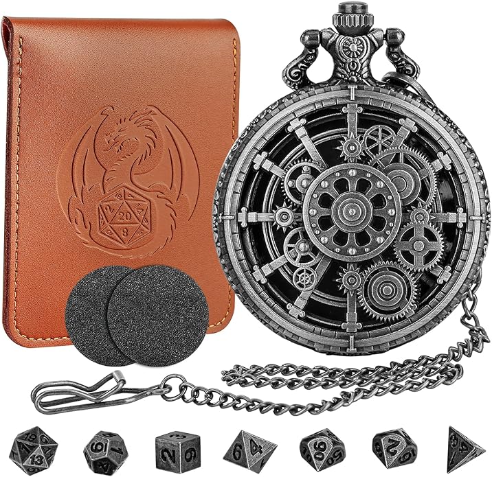 • Stylish Gear Design: This zinc alloy pocket watch case adopts a complex hollow gear design, steampunk style, and a unique and creative dnd dice pocket watch storage box to make your dnd table games more colorful
