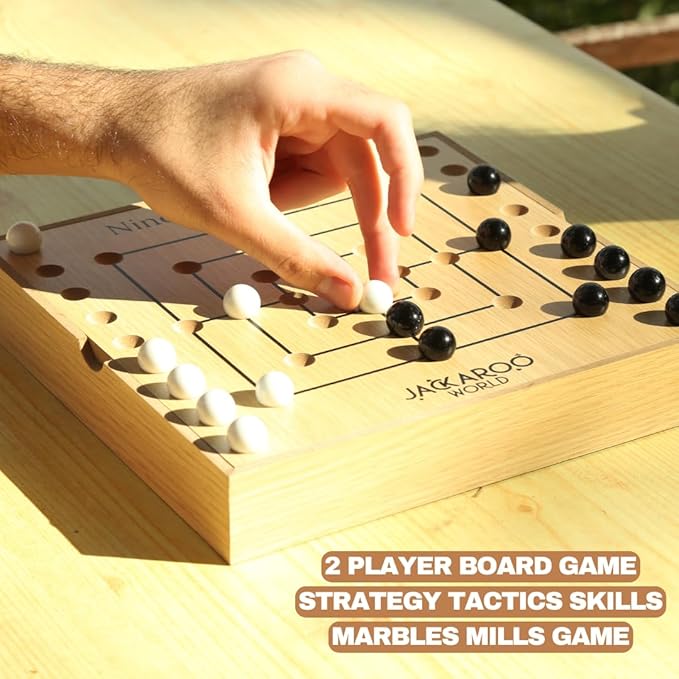 - Complete Wooden Game Set: Nine Men's Morris board game - Jackaroo World Box - Manual - Black and White Marbles; 18 Marbles (9 White - 9 Black)