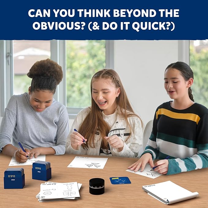 • RACE THE TIMER!: Flip a card and start the 60-second timer! Players must quickly draw 3 things using the shape on the card, excluding the object mentioned. If your drawing matches someone else’s, neither of you earn a point. At the end of the minute, everyone shares their drawings; each unique drawing scores one point. The player with the most points at the end wins!
