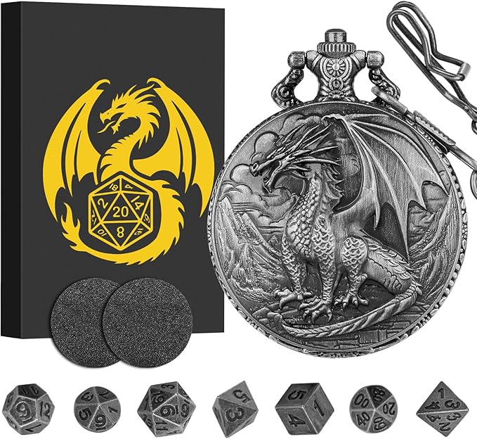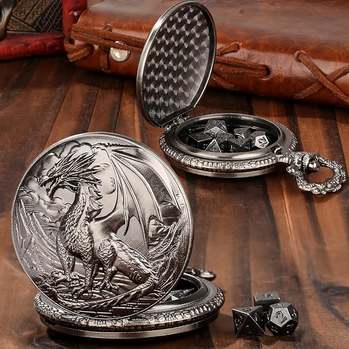 • Dragon Design: Exquisitely crafted with a mesmerizing Dragon motif, this pocket watch case has been ingeniously repurposed to store your 7 mini polyhedral dice set, creating a truly unique and captivating storage solution for your gaming essentials